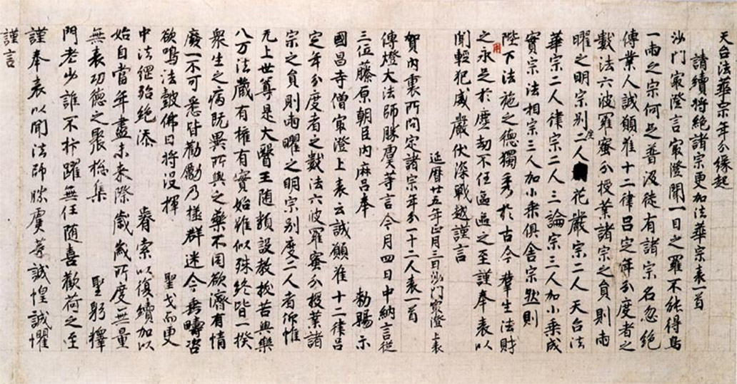 その後最澄は、真俗一貫の大乗菩薩戒こそが真に国を護り人々を幸せにすると考え、弘仁9年(818)から翌年にかけて山家学生式(さんげがくしょうしき)と呼ばれる一連の上表を行います。さらに弘仁11年(820)、『顕戒論』を著わして比叡山に大乗戒独立の允許を求めたのでした。