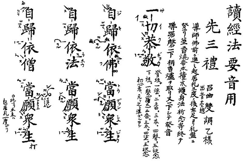 仏教の基本的な要素である仏(如来)とその教えである法(仏法)、その教えを実践する人(僧)の三つに帰依し、礼拝する声明。経典読誦法要などの最初に唱えられることが多い。