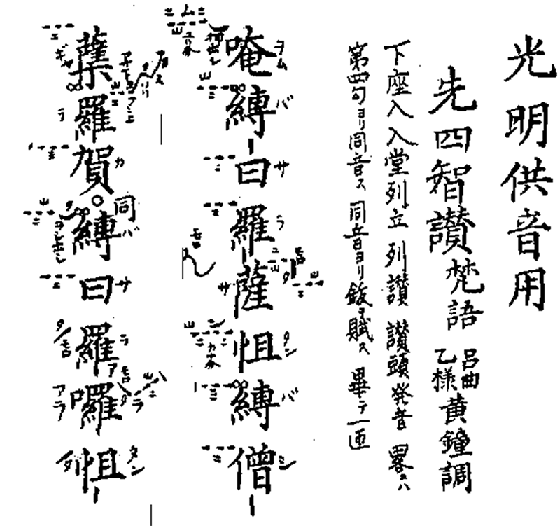 梵語讃(ぼんごさん)とはサンスクリット音を漢字で表記した声明曲である。内容は仏の四つの知恵を讃える詩で、鏡のようにあらゆるものを差別なく現し出す智(大円境智)、自他すべてのものが平等であることを証する智(平等性智)、平等の中におのおのの特性があることを証する智(妙観察智)、あらゆるものをその完成に導く智(成所作智)の四つが唱えられる。