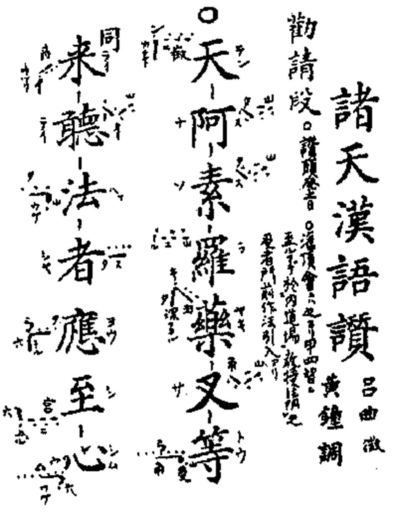 諸天漢語讃(しょてんかんごさん)は『大雲輪請雨経』の一節で、仏法護法の天部衆を賛嘆する声明曲である。大般若転読会や護摩、地鎮作法など祈願法要に多く用いられる。曲は定曲という四拍子の曲で、三段に分かれており、各段の終わりに鐃(にょう)と鈸(はち)が打ち鳴らされる。