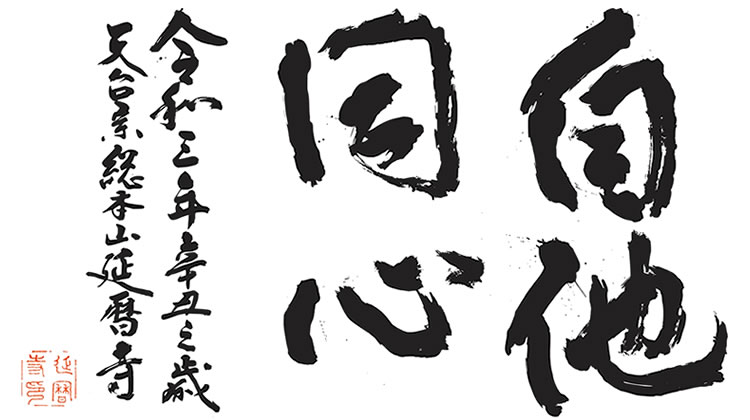 伝教大師は「己を忘れて他を利するは慈悲の極みなり」と仰いました。己を忘れるとは、他人を自分のことのように思うこと。他人の苦しみも悲しみも喜びも自分のことのように感じること。他人と私は同じ心を持っているのです。同じ心を持っているから分かり合えます。先ず他人を思いやり、身体は近づかなくても、心と心を近づけて「心を同じくす」「同心」を心がけましょう。