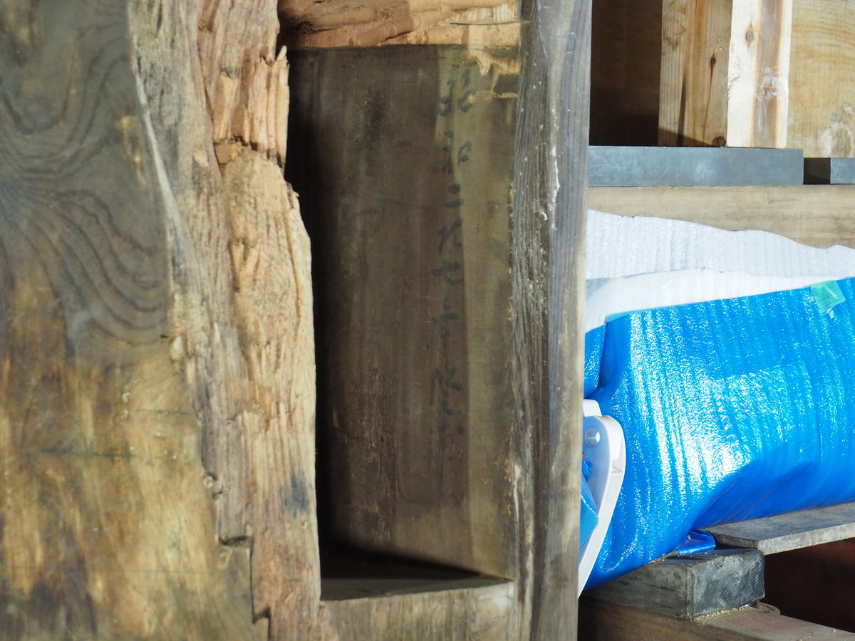 1本は南側車寄せ付近の柱を根継します。今回取り外した部材には昭和27年の墨書きがあり昭和の大修理でも根継が行われていたことがわかります。
