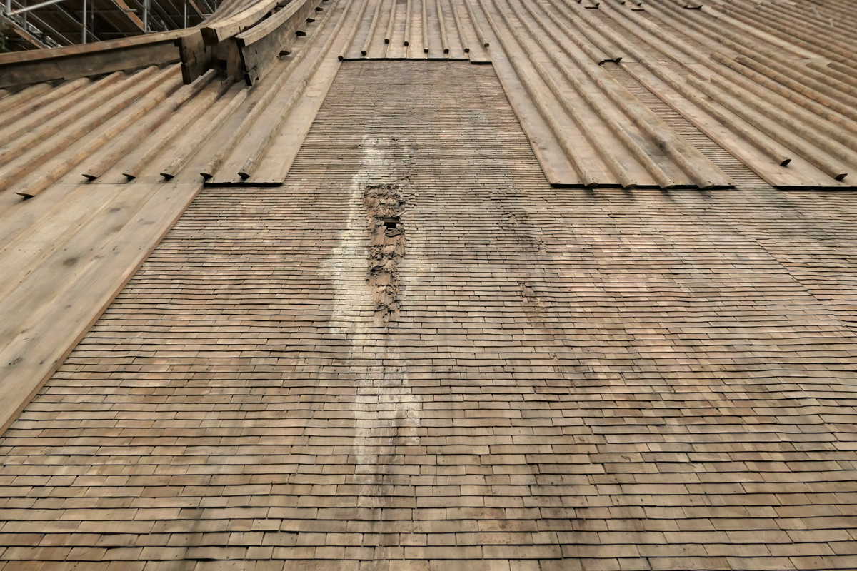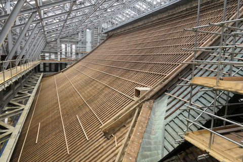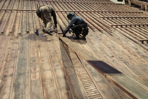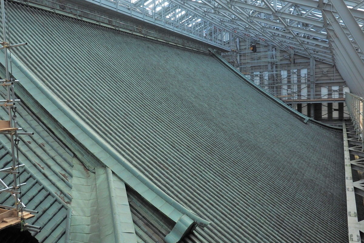 根本中堂の大屋根は下から土居葺(どいぶき)、「下地」、銅板葺(どうばんぶき)の三層構造となっています。