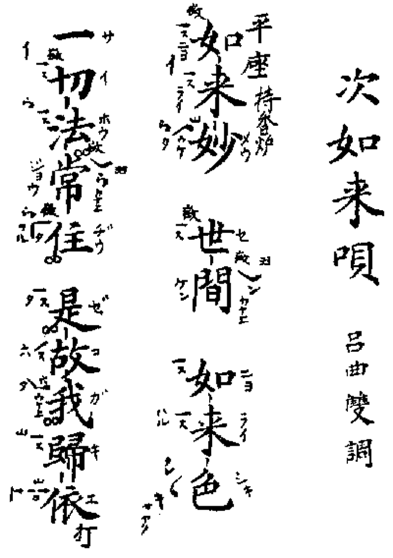 始段唄(しだんばい)では「如来妙色身 世」の部分を独特の旋律で唱え、中唄(ちゅうばい)では「間無與等 無比 不思議」の部分。行香唄(あんきゃんばい)では「如来色 無尽 知恵亦復然 一切法常住 是故我帰依」の部分を唱える。これらの「唄 」は大原魚山の伝法が必要でこの伝法のことを「唄伝」(ばいでん)と言う。