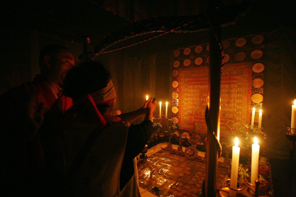 延暦寺では一般の方も受けることができる密教の入門式である結縁潅頂を毎年行っています。道場である潅頂堂には、中央に大きな曼荼羅が祀られ、香華燈明によって荘厳されている中、受者(潅頂を受ける人)は、天台声明の梵音に導かれ曼荼羅に華を投じてみ仏とのご縁を結び、大日如来の五智の法水を頭上に注がれてご縁をいただいた仏さまの智恵を授かることができます。