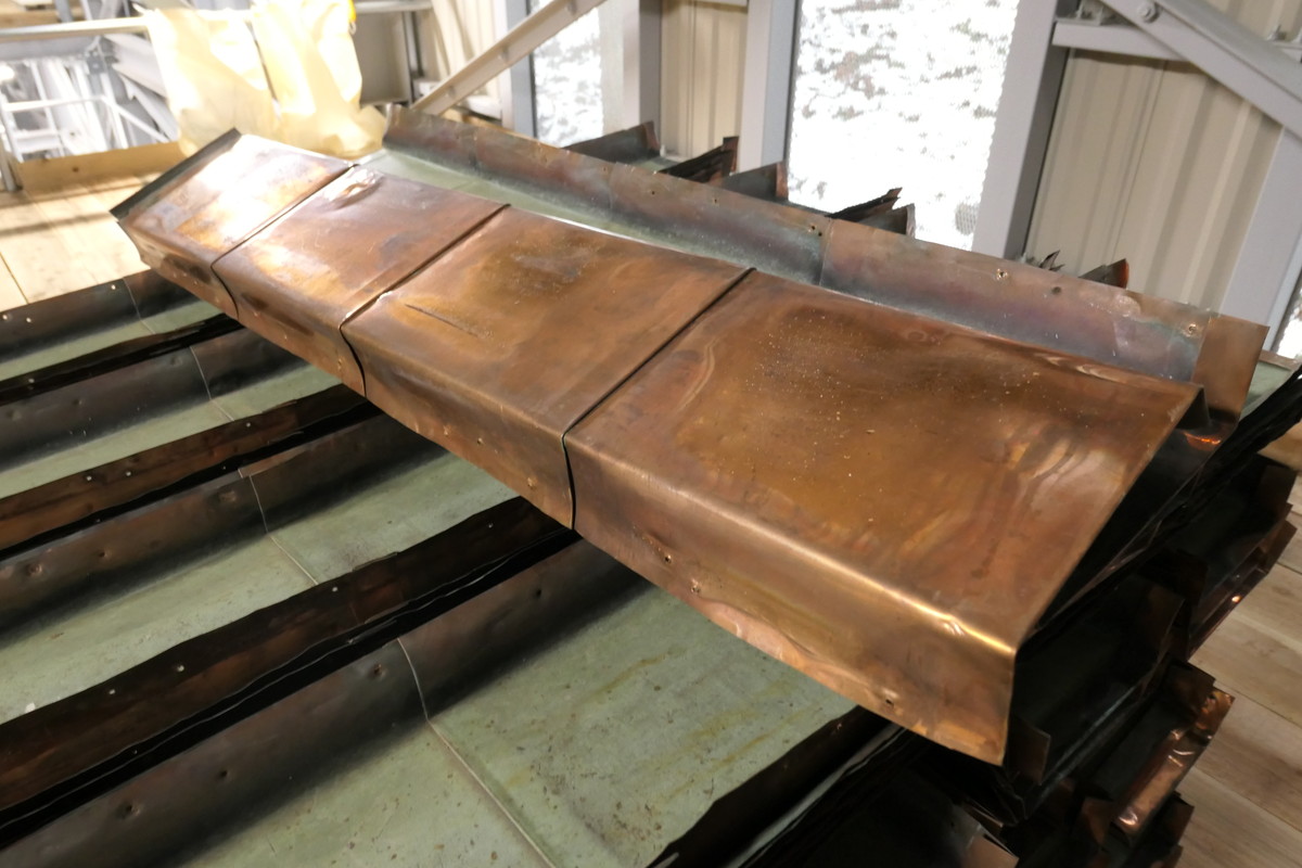表面は緑青がふいていますが裏面は銅の色が残っています。根本中堂の屋根には厚さ約0.5mmの銅板が使用されています。